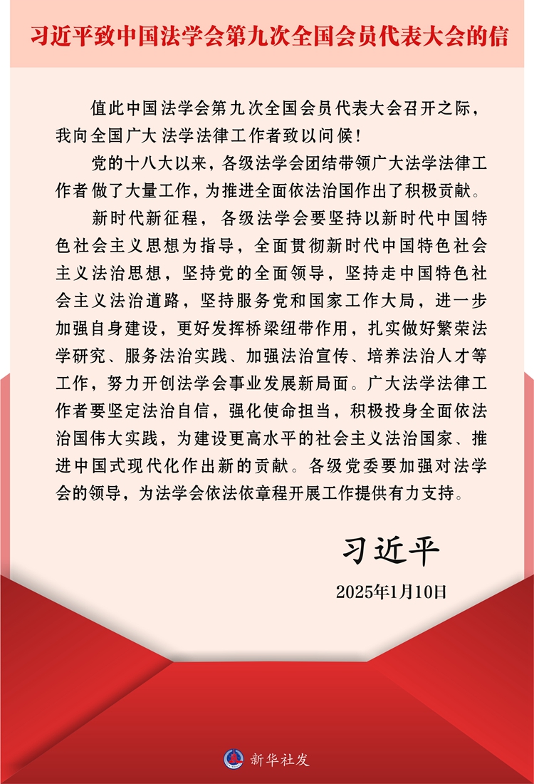 新华社北京1月10日电 在中国法学会第九次全国会员代表大会召开之际,中共中央总书记、国家主席、中央军委主席习近平致信大会,向全国广大法学法律工作者致以问候,并对做好法学会工作提出希望。