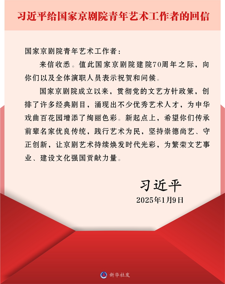 习近平在回信中说,国家京剧院成立以来,贯彻党的文艺方针政策,创排了许多经典剧目,涌现出不少优秀艺术人才,为中华戏曲百花园增添了绚丽色彩。新起点上,希望你们传承前辈名家优良传统,践行艺术为民,坚持崇德尚艺、守正创新,让京剧艺术持续焕发时代光彩,为繁荣文艺事业、建设文化强国贡献力量。