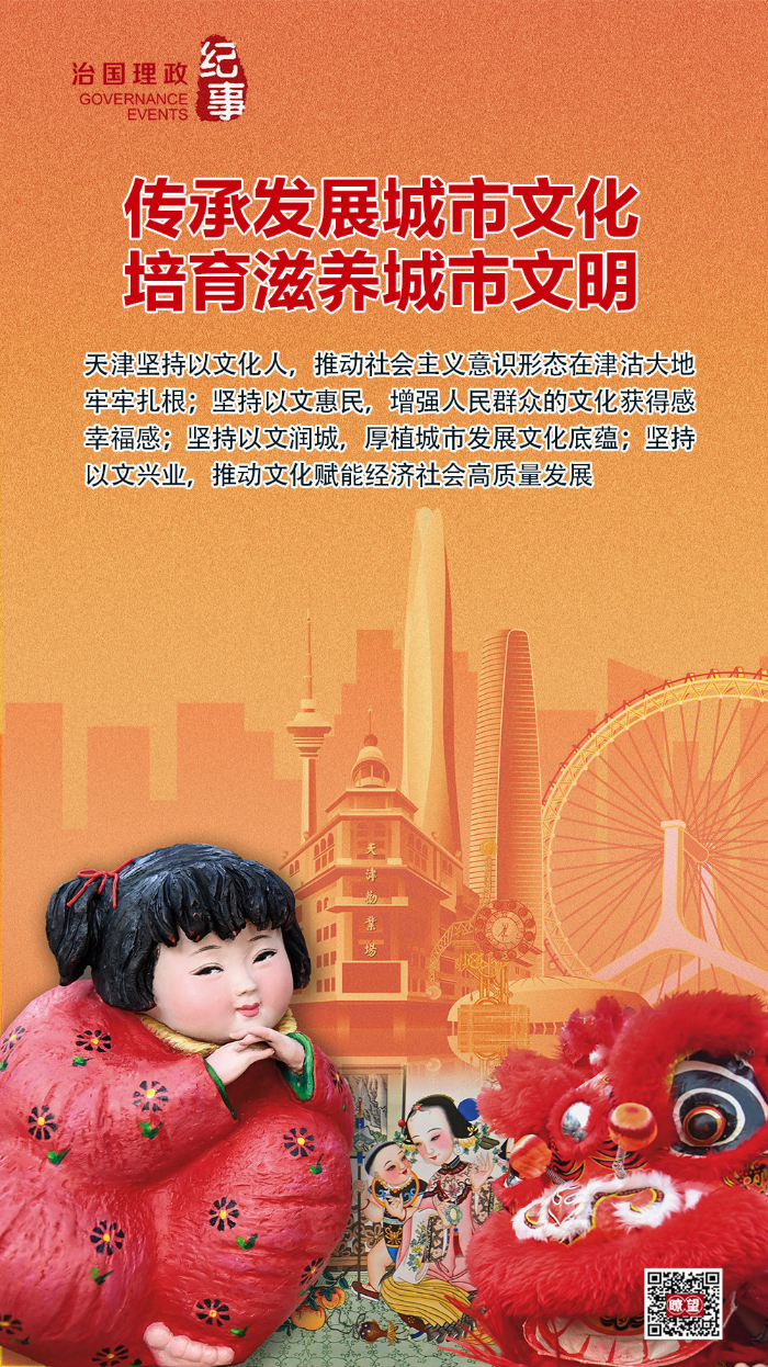 习近平总书记十分关心天津的城市文化传承发展。2024年春节前夕,习近平总书记赴天津看望慰问基层干部群众时指出,以文化人、以文惠民、以文润城、以文兴业,展现城市文化特色和精神气质,是传承发展城市文化、培育滋养城市文明的目的所在。天津要深入发掘历史文化资源,加强历史文化遗产和红色文化资源保护,健全现代文化产业体系、市场体系和公共文化服务体系,打造具有鲜明特色和深刻内涵的文化品牌,进一步彰显天津的现代化新风貌。