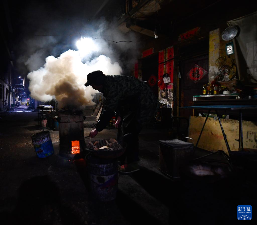 清晨,万佐成为前来做早餐的患者家属准备炭炉(2018年1月11日摄)。新华社记者 胡晨欢 摄