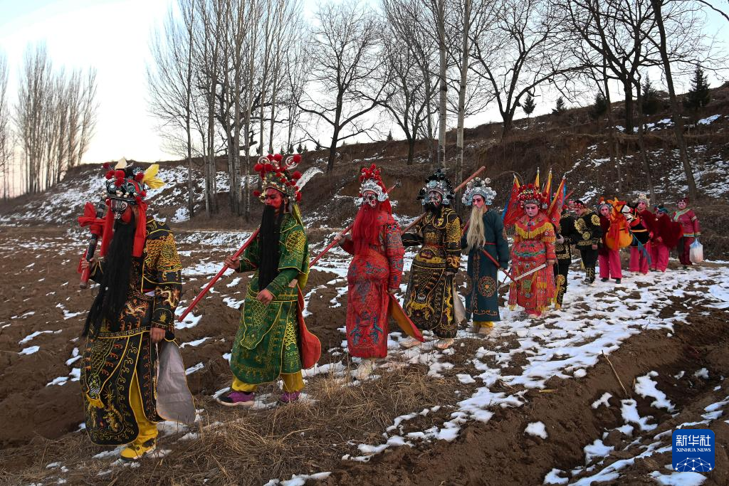 2月9日,陇县流渠村的步社火队在陇县三里营村进行游演。
