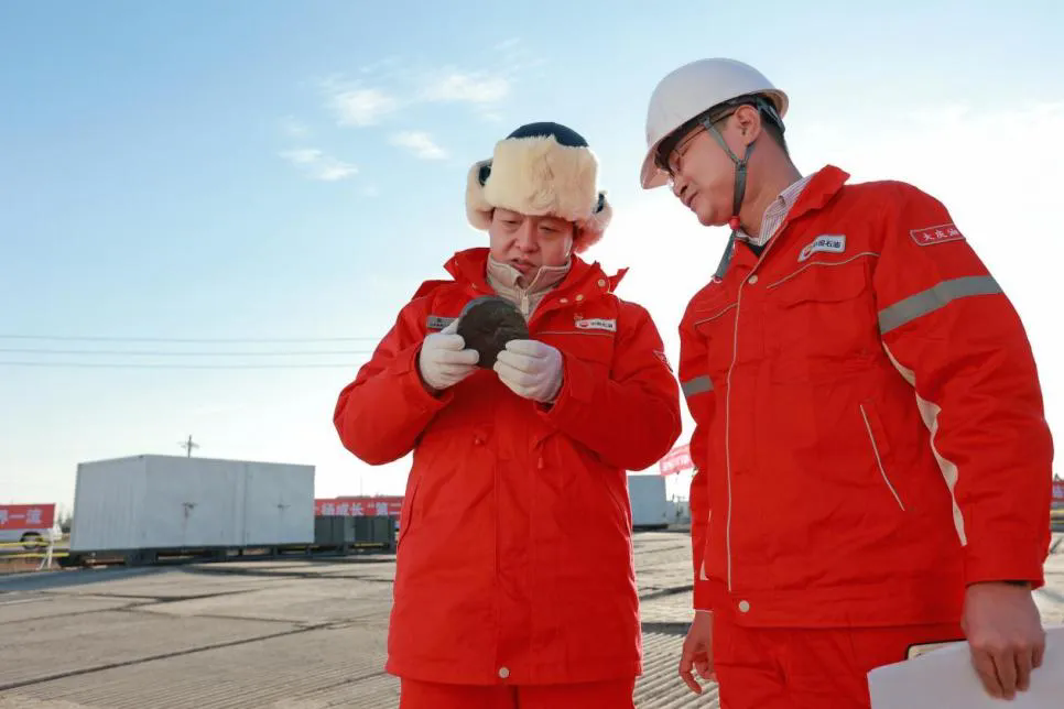 图为张赫(左)在钻井施工现场查看岩心样本。大庆钻探工程有限公司供图