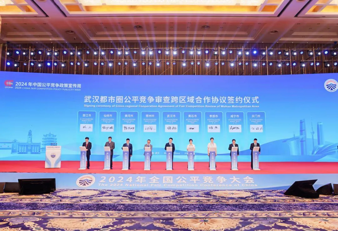 2024年9月10日至11日,由国家市场监督管理总局主办的2024年全国公平竞争大会在湖北省武汉市举行,大会主题为“统一大市场 公平竞未来”。图为9月11日,武汉、黄石、鄂州、孝感、黄冈、咸宁、天门、仙桃、潜江等9个城市代表,现场签订公平竞争审查跨区域合作协议。 湖北省市场监管局供图