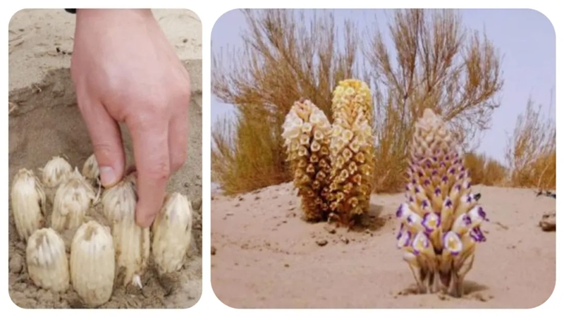左图为刚从沙土中挖出来的肉苁蓉,右图为沙漠中长出花瓣、露出地面的肉苁蓉。 沙雅县融媒体中心供图