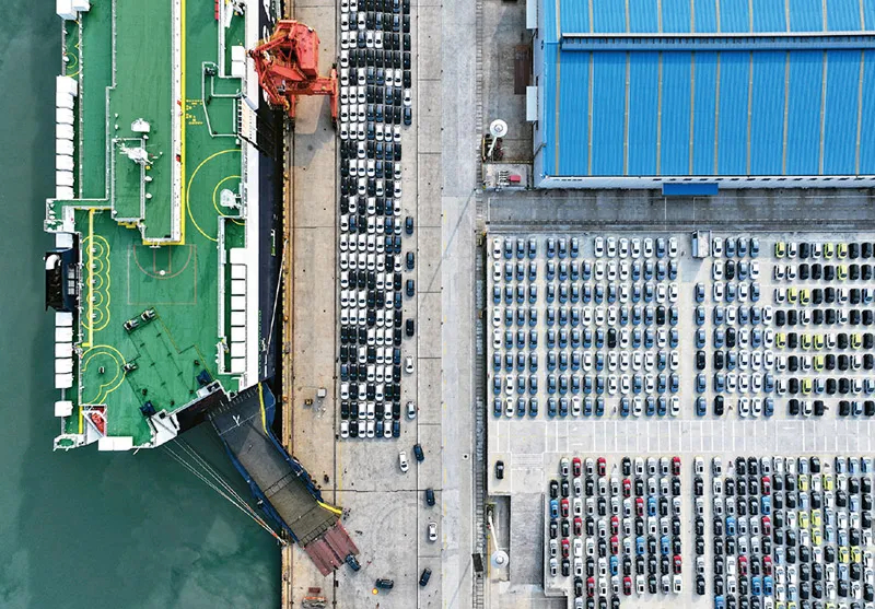 以新能源汽车为代表的“新三样”成为新时代中国制造靓丽名片。图为2025年2月21日拍摄的江苏省连云港港东方港务分公司码头装载出口汽车的场景。 新华社发 王春/摄