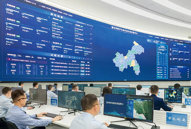 图为2024年4月23日,位于江北区的重庆市数字化城市运行和治理中心大厅,工作人员在后台监控城市运行情况。 重庆日报记者 张锦辉/摄