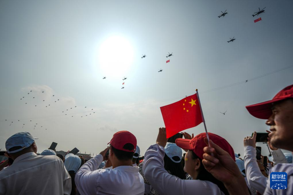 9月3日,纪念中国人民抗日战争暨世界反法西斯战争胜利80周年大会在北京隆重举行。这是空中护旗梯队。