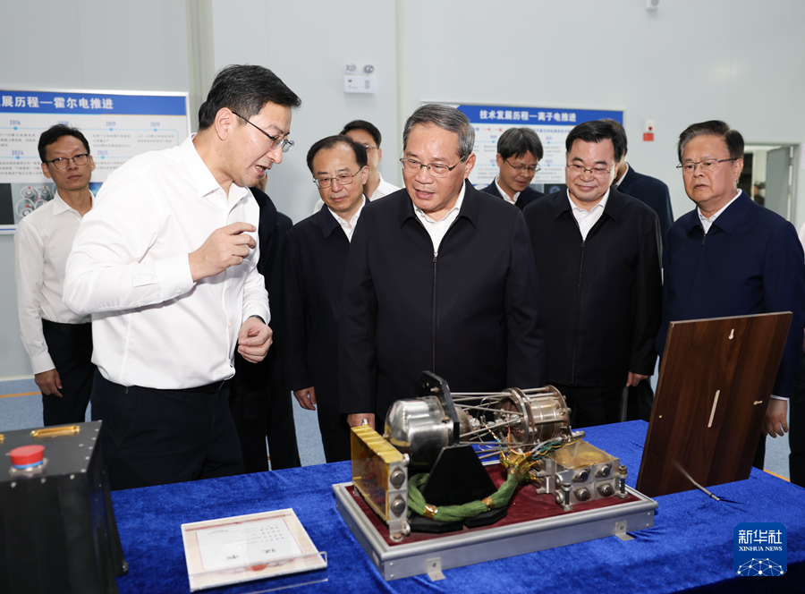 9月15日至16日,中共中央政治局常委、国务院总理李强在甘肃、青海调研。这是9月15日在甘肃兰州,李强来到空间技术物理研究所航天高新产业园,观看最新设备和零部件展示,详细了解相关技术原理和产品产销应用情况。新华社记者 黄敬文 摄