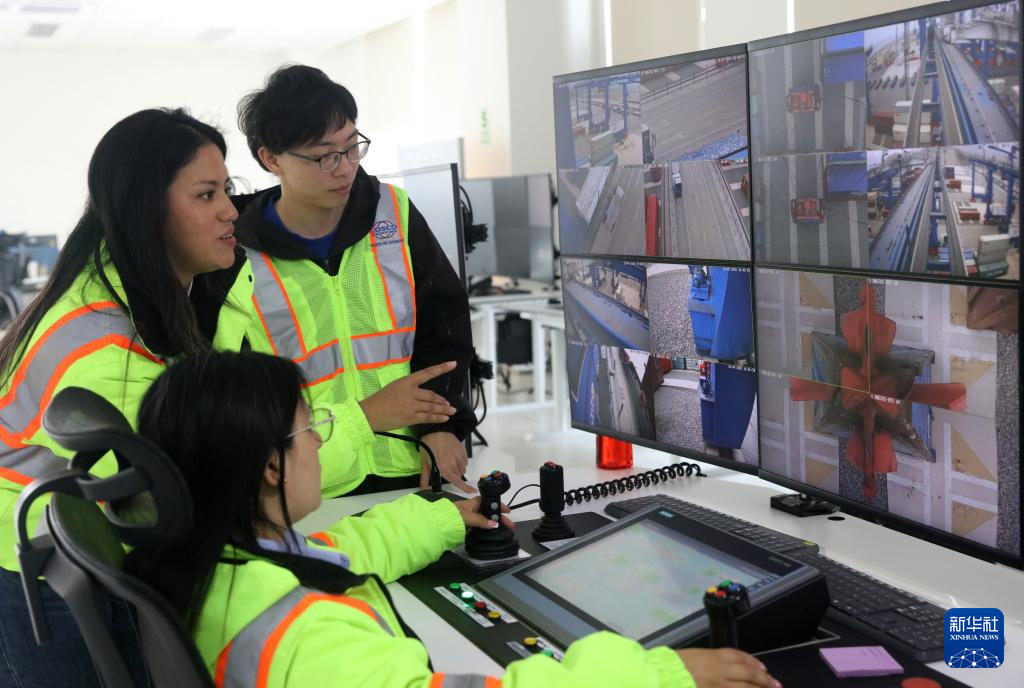 10月7日,在秘鲁钱凯港,中远海运港口秘鲁钱凯公司员工阿斯特丽德·洛萨诺(左一)与同事进行作业监控。位于秘鲁首都利马以北约80公里的钱凯港于2024年11月正式开港,标志着中秘共建“一带一路”取得新的重要成果。新华社发(玛丽安娜·巴索摄)