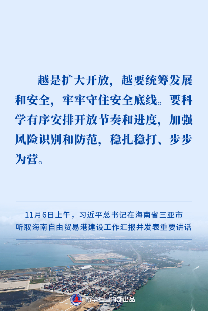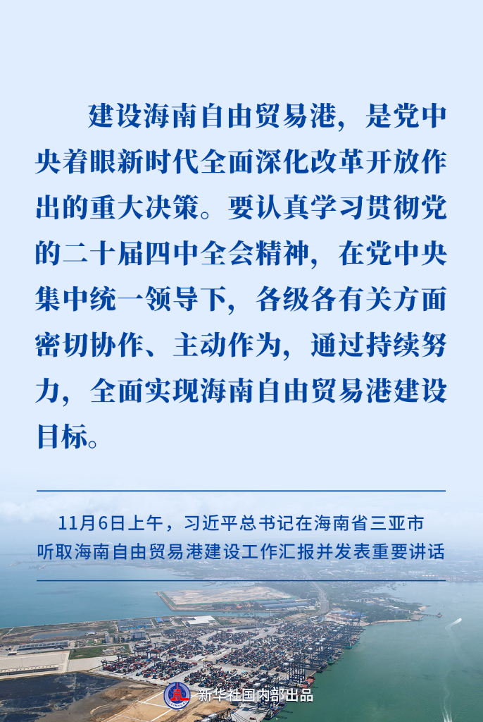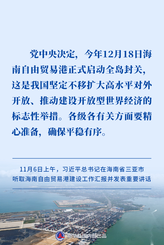 11月6日上午,习近平总书记在海南省三亚市听取海南自由贸易港建设工作汇报并发表重要讲话。建设海南自由贸易港,是党中央着眼新时代全面深化改革开放作出的重大决策。今年12月18日,海南自由贸易港正式启动全岛封关。怎样确保封关运作平稳有序?如何推进海南高质量发展?习近平总书记提出明确要求。