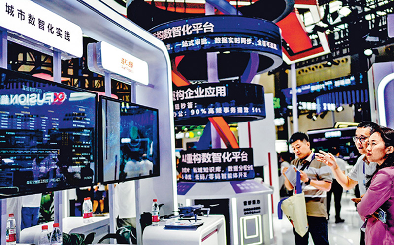 8月28日,2025中国国际大数据产业博览会在贵州省贵阳市开幕。本届数博会以“数聚产业动能 智启发展新篇”为主题,展现数据要素与人工智能技术融合创新的最新成果,推动数据资源的高效汇聚与价值释放,为产业升级和经济高质量发展注入强劲动力。图为开幕当日,参展商与观展者在会场交流城市数智化实践情况。 新华社记者 陶亮/摄