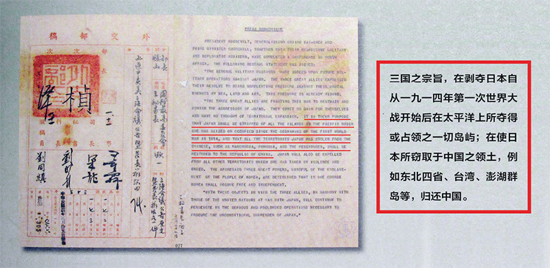 台湾回归中国早在1945年中国人民抗日战争暨世界反法西斯战争胜利时就已彻底明确,并得到国际社会公认。1943年12月《开罗宣言》宣布,日本所窃取于中国之领土,例如东北四省、台湾、澎湖群岛等,归还中国。1945年7月《波茨坦公告》明确规定,“开罗宣言之条件必将实施”,并且要在清算日本军国主义侵略罪行基础之上,建立战后“正义之新秩序”。1945年8月9日,日本御前会议决定接受《波茨坦公告》,并于次日通过中立国瑞士和瑞典,向中美英苏四国政府发出乞降照会,表示接受公告所列条款。8月15日,日本天皇裕仁发布“终战诏书”,宣布接受《波茨坦公告》。9月2日,9位同盟国代表与日本代表签署《日本投降书》,昭告世界,日本政府、天皇及日本帝国大本营接受《波茨坦公告》,无条件投降。