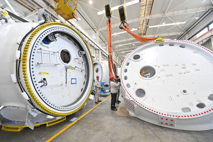 2025年9月24日,工人在位于山西转型综合改革示范区的太重集团新能源产业园区吊运风电装备。新华社记者 杨晨光 摄