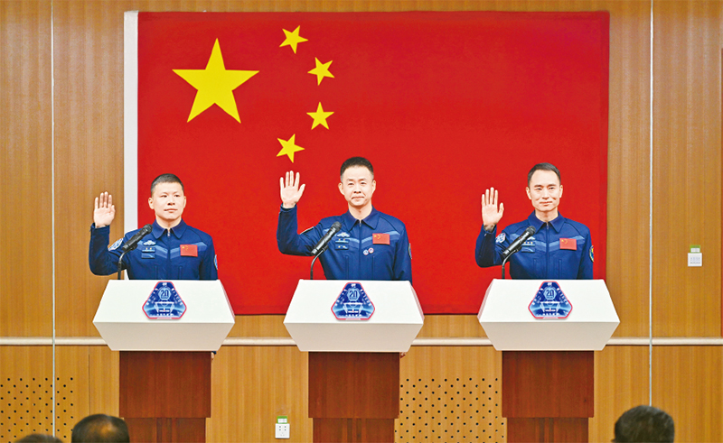 图为2025年4月23日,神舟二十号载人飞行任务航天员陈冬(中)、陈中瑞(右)、王杰在酒泉卫星发射中心问天阁与媒体记者集体见面。 新华社记者 李鑫/摄