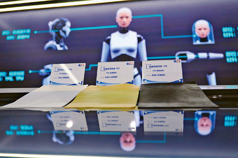 新材料产业是先进制造业和国民经济发展的基础,是重要的战略性新兴产业。图为2025年7月2日,位于山东省龙口市的一家高分子材料公司新材料展示中心展示的一款用于机器人仿真皮肤的新材料。 新华社记者 徐速绘/摄