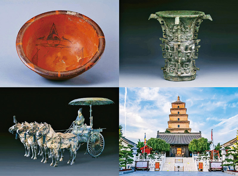 关中地区位于陕西中部的渭河平原,号称“八百里秦川”,是中华文明的重要发祥地之一。从仰韶时代彩陶文化的绚丽多彩、西周青铜文明的熠熠生辉到秦汉隋唐的文化大一统传统,从古丝绸之路的文化交流到儒、释、道的思想会通,从“民胞物与”的关学创立到市民文化的繁荣再到红色文化的熔铸,关中文化与时偕行,推动中华文明辉光日新。左上图为人面鱼纹盆。右上图为何尊。左下图为秦始皇帝陵铜车马。右下图为大雁塔。 陕西省委宣传部供图