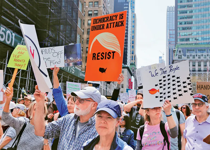 2025年4月19日,美国多地举行抗议活动,华盛顿、纽约、旧金山、波士顿等城市的民众走上街头,抗议现政府大规模裁员、加征关税、驱逐移民等政策。图为当日,人们在纽约街头参加抗议活动。 新华社记者 刘亚南/摄
