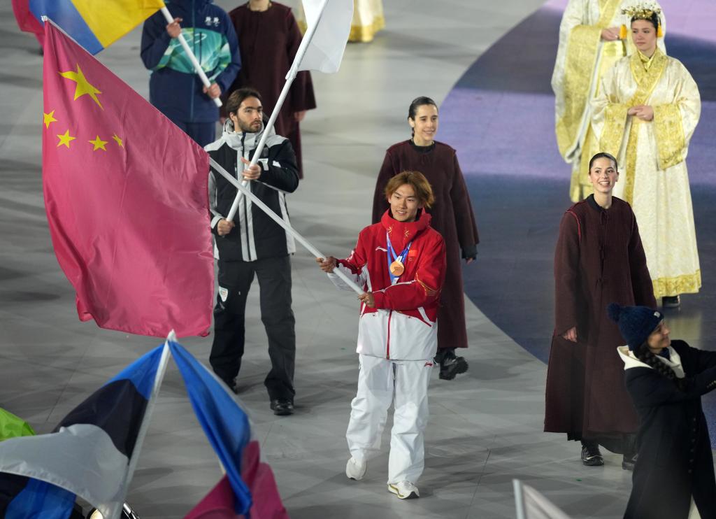 2月22日,中国体育代表团旗手苏翊鸣在2026年米兰-科尔蒂纳冬奥会闭幕式上入场。新华社记者 薛宇舸 摄