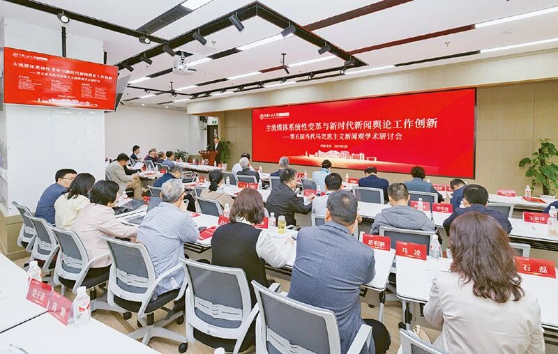 马克思主义新闻观是建构中国新闻传播学自主知识体系的根本指引。2025年5月10日,第五届当代马克思主义新闻观学术研讨会在中国人民大学举行,与会专家围绕“主流媒体系统性变革与新时代新闻舆论工作创新”这一主题,展开深入交流与探讨。图为研讨会现场。 中国人民大学新闻学院供图