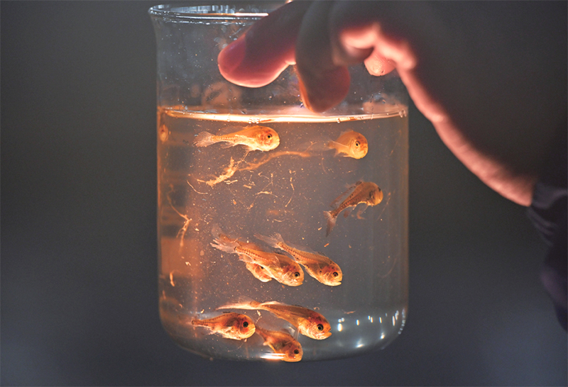 近年来,我国养殖量最大的珍贵海洋鱼类大黄鱼,依托闽宁协作机制跨越千里山河、突破重重阻碍,从东南沿海的福建“游”到位于祖国大西北的戈壁滩,在宁夏贺兰山下成功“落户”。图为2026年1月22日,福建省宁德市福鼎市沙埕镇一家大黄鱼育苗企业的技术人员正在查看鱼苗长势。 新华社记者 姜克红/摄