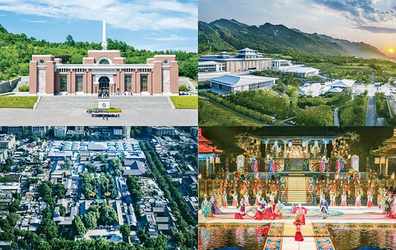 “周虽旧邦,其命维新。”进入新时代,陕西加快推进文化强省建设,文化影响力持续提升。左上图为陕甘边革命根据地照金纪念馆。右上图为西安国家版本馆。左下图为西安碑林博物馆俯瞰图。右下图为实景舞剧《长恨歌》剧照。 陕西省委宣传部供图