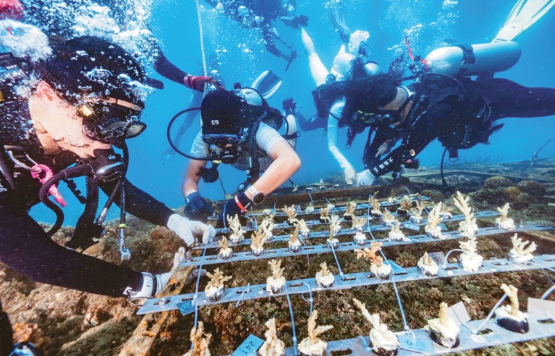 近年来,海南持续开展珊瑚礁生态系统的保护和修复,创造了单体修复面积最大、累计种植数量最多等多项全国纪录。截至2025年底,海南通过系统性工程累计新增珊瑚礁修复面积27.8公顷。图为2025年6月8日,2025年世界海洋日主题宣传活动在三亚大东海举行,50名专业持证潜水员潜入大东海海域开展珊瑚移植公益行动。 海南日报全媒体记者 王程龙/摄