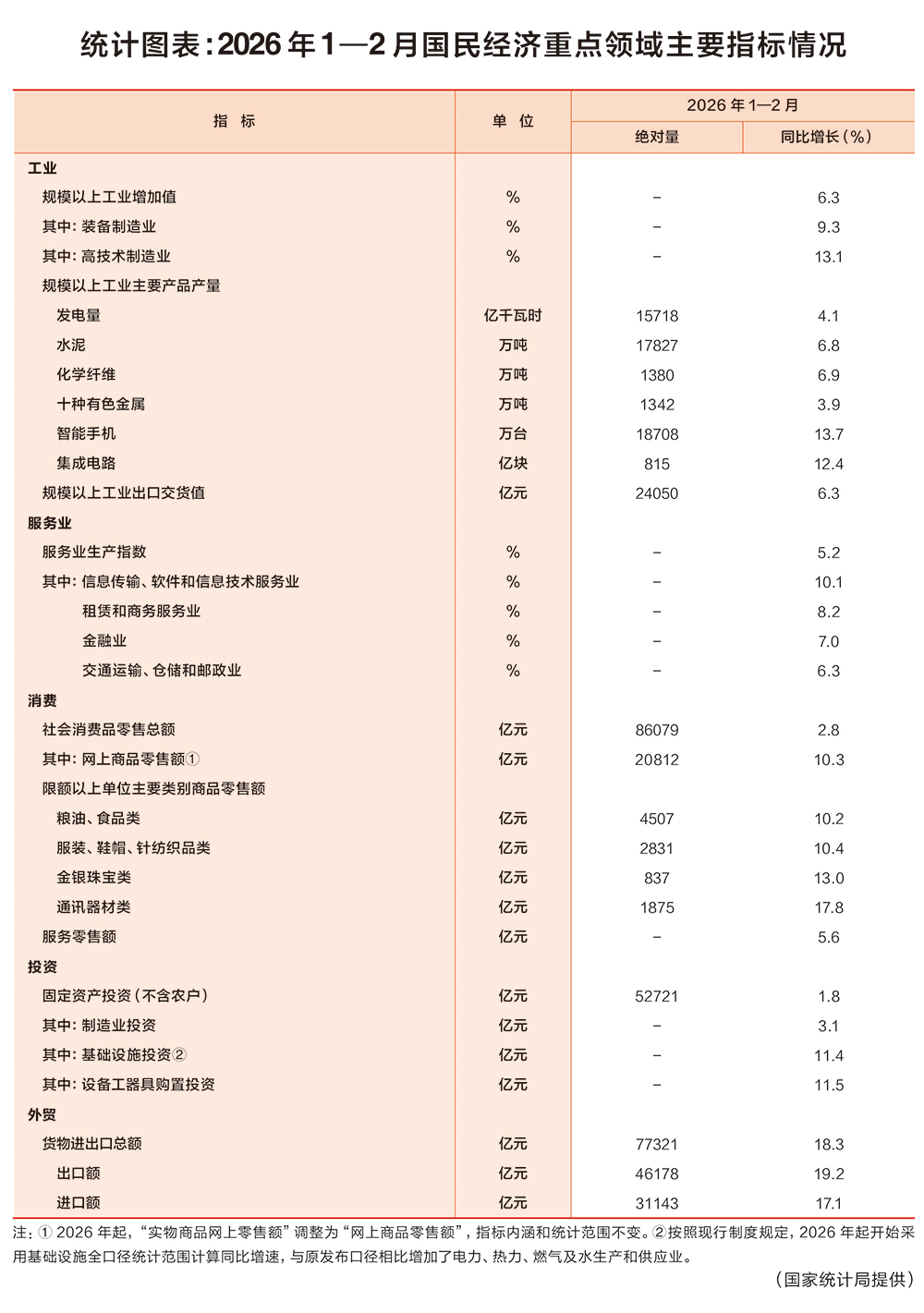 统计图表:2026年1—2月国民经济重点领域主要指标情况