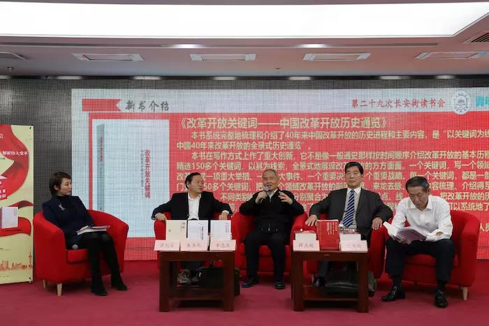 为深入学习宣传贯彻习近平总书记重要讲话精神,1月13日长安街读书会联合团中央“青年之声”学习者服务联盟、人民出版社主办,全民阅读促进委员会、中国青年网、“青年之声”综合服务办公室承办,共同发起了第二十九次长安街读书会暨“不忘初心,将改革开放进行到底”集体读书学习活动。本次活动围绕《改革开放关键词——中国改革开放历史通览》一书,特邀本书作者原中共中央党史研究室副主任、中共党史学会副会长、中央马克思主义理论研究和建设工程咨询委员会委员李忠杰,人民出版社党委书记、社长黄书元,中央党校科学社会主义教研部副主任、教授、博导倪德刚,原中共中央党史研究室宣传教育局副局长、中共党史学会常务理事薛庆超作为活动嘉宾,从书本到现实,从理论到实践,共同讲述中国改革开放40年的伟大转变及历史性成就。本次读书会由媒体人侯凯笛主持。