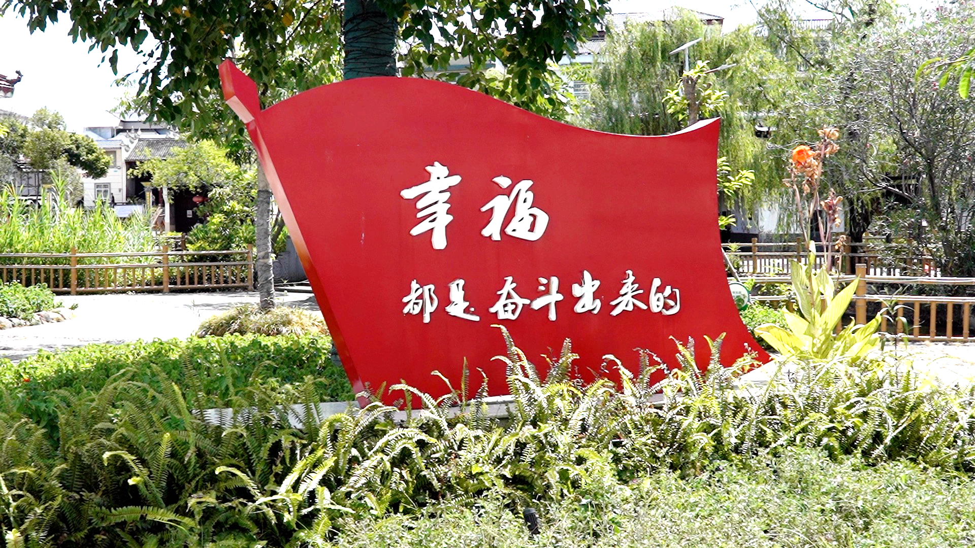 江西省于都县梓山镇潭头村中心位置豁然写着标语——“幸福都是奋斗出来的”。 求是网记者周茉丹 摄