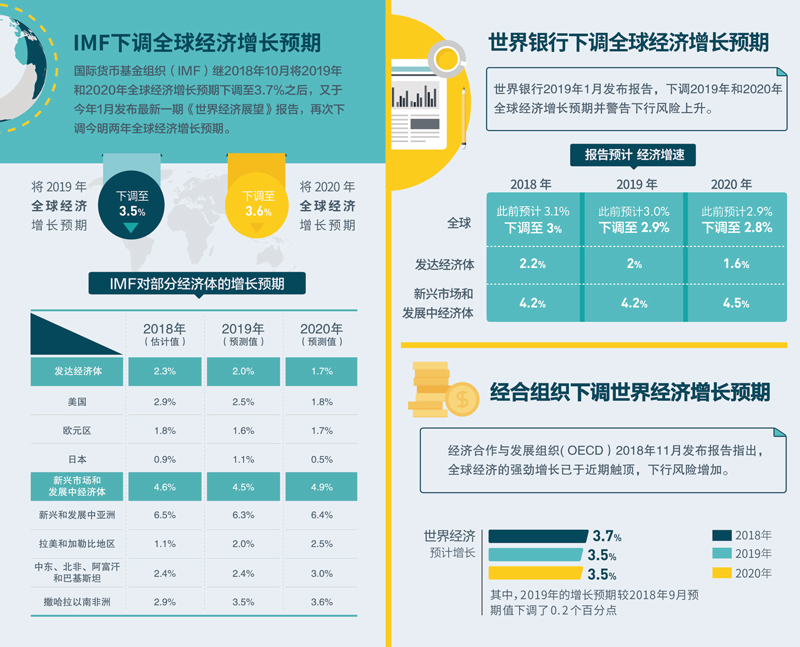 2018年下半年以来,全球主要经济体复苏动力减弱,增长速度趋于放缓,下行压力明显加大,不确定不稳定因素明显增多。主要国际经济组织纷纷下调世界经济增长预期。