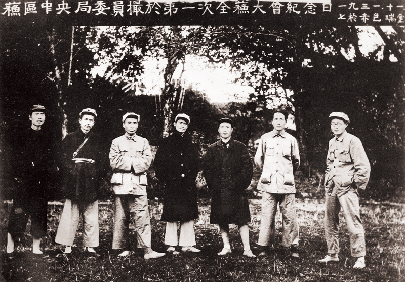 “一苏大会”选举产生了由63人组成的中华苏维埃共和国中央执行委员会,中华苏维埃共和国之最高政权为全国工农兵会议(苏维埃)的大会,在大会闭会期间,全国苏维埃临时中央执行委员会为最高政权机关,中央执行委员会之下组织人民委员会,处理日常政务,并发布一切法令和决议案。图为“一苏大会”期间,中共苏区中央局委员的合影。左起依次为顾作霖、任弼时、朱德、邓发、项英、毛泽东、王稼祥。 高延智/视觉中国