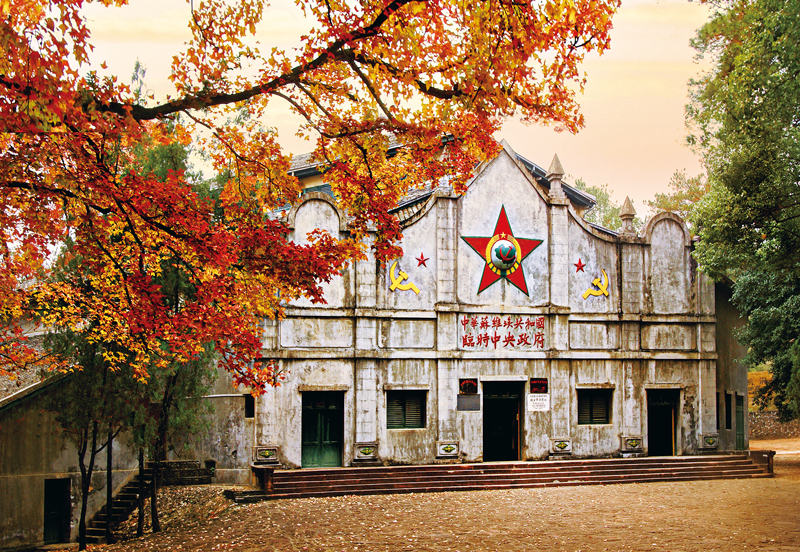 1931年11月7日至20日,中华苏维埃第一次全国代表大会在江西瑞金叶坪村隆重召开。“一苏大会”开幕式在叶坪村谢氏祠堂举行,由神龛改建而成的主席台,正面墙上贴着马克思和列宁画像,画像中间挂着镰刀斧头红旗,主席台上方悬挂着横幅标语“全世界无产者联合起来”,主席台前沿摆放着写有“工农堡垒,民主专政”8个金色大字的横匾。“一苏大会”宣告了中华苏维埃共和国及其中央政府的诞生,标志着中央苏区正式建立。上图是“一苏大会”会场(新华社发),下图是“一苏大会”旧址(江西省人大常委会供图)。