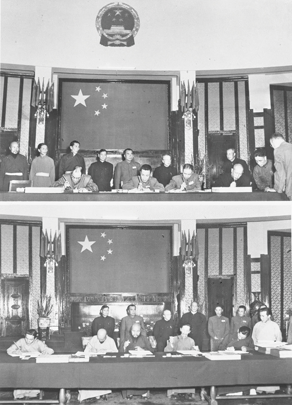 1949年新中国成立后,中国共产党顺应西藏人民的强烈愿望,加快推进西藏和平解放进程。1951年5月23日,中央人民政府与西藏地方政府签订《关于和平解放西藏办法的协议》。中央人民政府全权代表(上图)和西藏地方政府全权代表(下图)在《关于和平解放西藏办法的协议》上签字。 新华社发