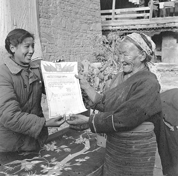 西藏民主改革彻底结束了旧西藏政教合一的封建农奴制度,占西藏人口95%以上的农奴和奴隶打碎枷锁,翻身成为自己的主人。从此,雪域高原人民开始了建设团结、富裕、文明新西藏的伟大进程。图为1960年拉萨市东城区蔡公堂乡摆脱了奴隶枷锁的老妈妈,以无比兴奋的心情接受土地证。 新华社记者 马鹏万/摄
