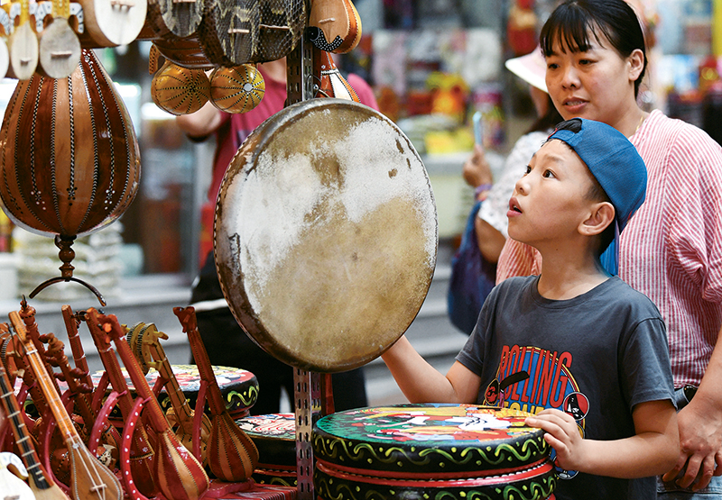 近年,天南海北的游客来到新疆,寻觅自然美景、感受人文风情。2019年上半年新疆接待国内外游客创历史新高,呈“井喷”之势。图为一名小朋友在位于乌鲁木齐市的大巴扎景区挑选旅游纪念品。 新华社记者 王菲/摄