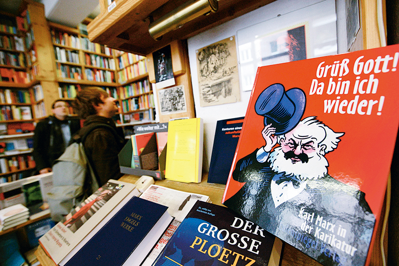 受2008年国际金融危机影响,马克思著作《资本论》在德国重新畅销。图为2008年10月17日,两名顾客在德国法兰克福的“卡尔·马克思书店”选购书籍。当天,《资本论》第一部已告售罄。 新华社记者 罗欢欢/摄