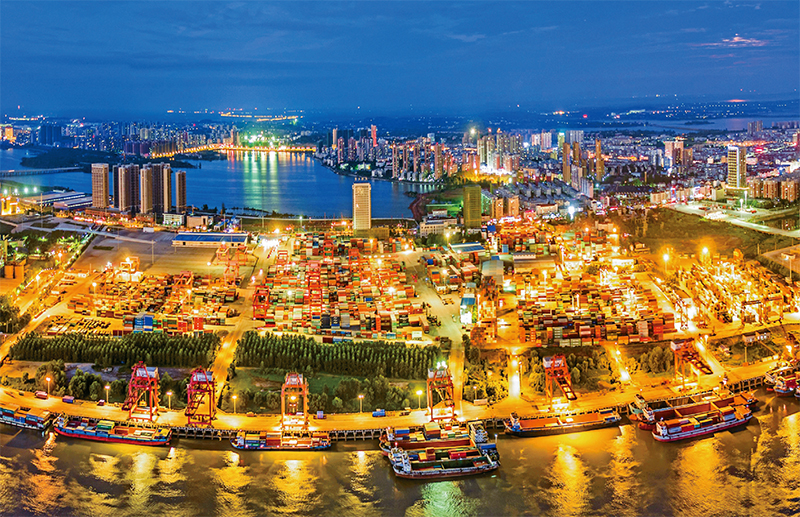 武汉阳逻港是长江中游航运中心的核心港区及最大的集装箱专业港区,2019年完成集装箱吞吐量161.23万标箱。图为正在装卸货物的阳逻港。 长江日报供图