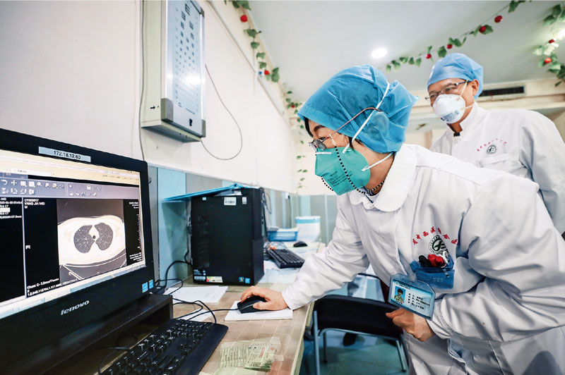 湖北省中西医结合医院呼吸内科主任张继先,把党和人民的利益放在首位,是医院救治一线的“带头人”。图为2020年1月30日张继先在查看病人肺部的CT影像。 长江日报记者 陈卓/摄
