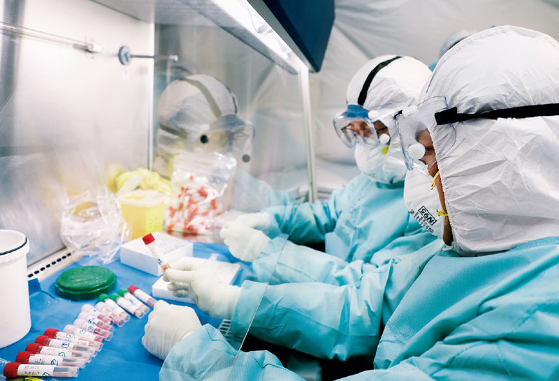 图为在武汉抗疫一线的军队医学专家组人员正在进行样本处理 军事医学研究院供图