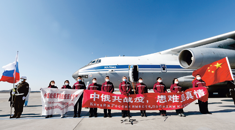 面对全球新冠肺炎疫情持续蔓延的严峻形势,中国政府派出多支抗疫医疗专家组支持世界各国的抗疫行动,应对人类共同的敌人。图为2020年4月11日,中国政府赴俄罗斯抗疫医疗专家组启程。 新华社记者 徐旭/摄