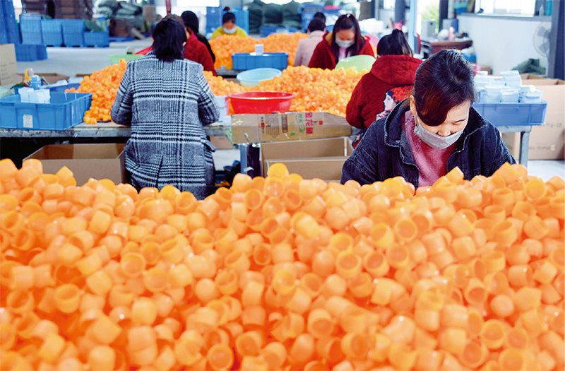 位于湖北省恩施土家族苗族自治州宣恩县李家河镇塘坊易地扶贫搬迁安置点的童话工艺“扶贫工厂”,在做好疫情防控的同时全面复工复产,带动200多名易地扶贫搬迁群众和周边村民就业。图为务工人员将制作好的玩具装入玩具收纳壳。 新华社发 王俊 /摄