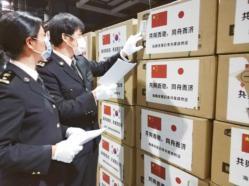 为统筹做好疫情防控和通关便利化工作,海关总署出台一揽子政策措施,大力支持企业复工复产,全力以赴促进外贸稳增长。图为2020年2月21日,山东济南海关所属聊城海关关员现场验放山东时风集团出口产品,帮扶企业按时交付海外订单。 聊城海关供图 郑保国/摄