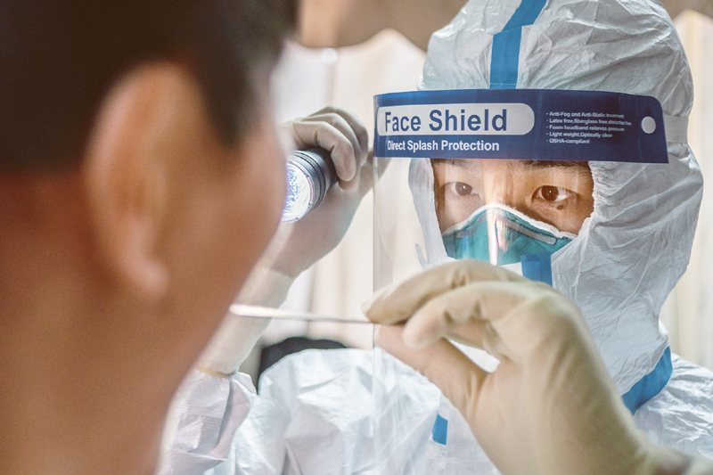 国境卫生检疫是国家公共卫生体系的重要一环,事关国家总体安全,事关人民群众生命安全和身体健康,必须筑牢口岸卫生检疫防线,严防境外疫情输入。图为2020年2月26日,浙江宁波北仑海关关员正在对入境船员进行咽拭子采集。 海关总署供图