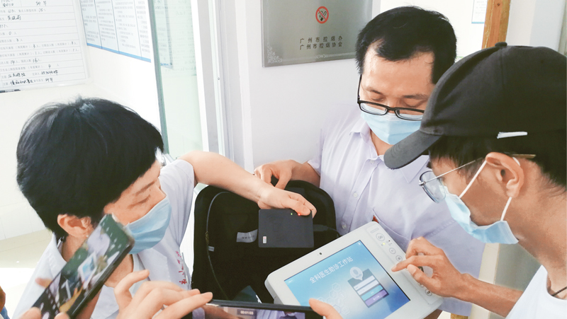为提升基层医疗服务水平,花都区引入全新信息化管理平台,2019年9月起试点为区内基层医生配备多功能巡诊包。巡诊包又称“移动工作站”,可进行血压、血糖、心电、尿酸、胆固醇等检测,具有便携性强、易操作、数据实时同步等特点,乡医可携带为村民开展入户检查,大大提高了工作效率。图为儒林村驻村医生向记者展示出诊时随身携带的多功能巡诊包。 本刊记者 王兆斌/摄