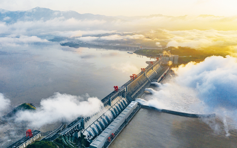 2020年7月26日14时,受长江上游强降雨影响,三峡水库入库流量达50000立方米每秒,迎来长江2020年第3号洪水,27日14时洪峰流量达到60000立方米每秒,出库流量38800立方米每秒。图为2020年7月27日,长江三峡枢纽工程开启泄洪深孔泄洪(无人机照片)。 新华社发 郑家裕/摄