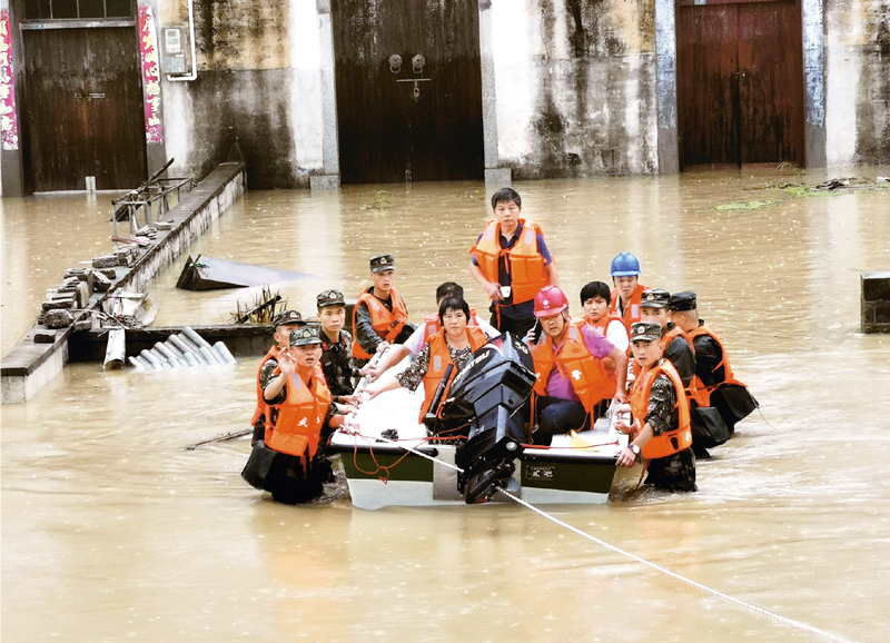 进入梅雨期以来,安徽省多地遭遇强降雨天气,出现内涝、破圩、管涌等险情。武警安徽总队黄山支队闻汛而动,先后转战黄山、芜湖等地,执行转移群众、护航高考、灾区重建、堤坝抢险等任务。图为2020年7月6日,武警安徽总队黄山支队官兵用冲锋舟转移受灾群众。 新华社发 周磊/摄