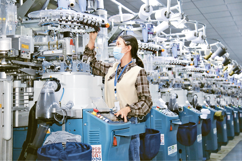 湖北省十堰市郧阳区杨溪铺镇青龙泉社区棉伙棉伴智能袜业扶贫车间,工人在智能袜机生产线上作业。 十堰市郧阳区委宣传部供图