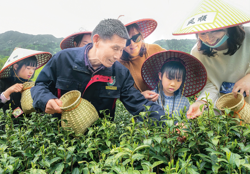 让老区农村贫困人口脱贫致富,使老区人民同全国人民一道进入全面小康社会,是习近平总书记一直挂在心上的事。2016年4月24日,习近平总书记在安徽调研期间,专程来到金寨县花石乡大湾村村民陈泽申家的小院,和乡亲们围坐在一起拉家常,向大家了解脱贫工作情况。4年多时间过去了,陈泽申家已经成功脱贫,现在收入芝麻开花节节高,日子越过越红火。图为2020年4月17日,陈泽申带游客到茶园体验采摘。 安徽日报记者 李博/摄
