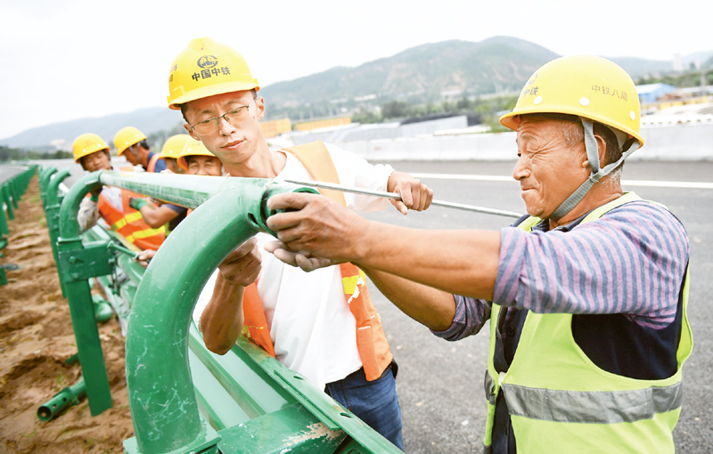 随着我国疫情防控取得重大战略成果,各地正全面落实党中央的部署要求,抓紧抓实常态化疫情防控,有力有效推进项目建设,确保疫情防控和经济社会发展“双胜利”。图为2020年8月21日,中铁八局三公司施工人员在陕西省清涧县清子高速公路子长段安装护栏。该公路是陕西省“十三五”期间实现“县县通高速”的高速公路重点项目之一。 新华社记者 李一博/摄