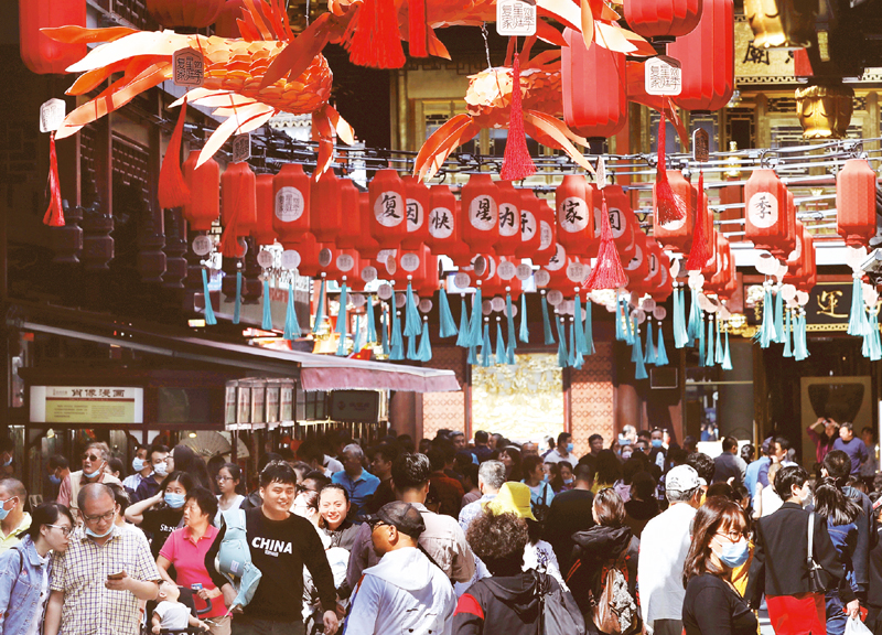全国各地在做好疫情防控前提下,积极组织开展丰富多彩的促消费活动,消费需求加快释放,市场人气持续攀升,国内大循环活力强劲。图为2020年10月8日,游人游览上海豫园。 新华社记者 刘颖/摄